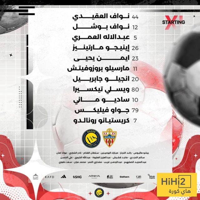 هاي كورة: أعلن المدير الفني لنادي النصر، بقيادة خورخي خيسوس، تشكيل الفريق لمباراة اليوم الودية أمام ألميريا، وذلك في إطار الاستعداد للموسم الجديد، وجاء التشكيل كالتالي: