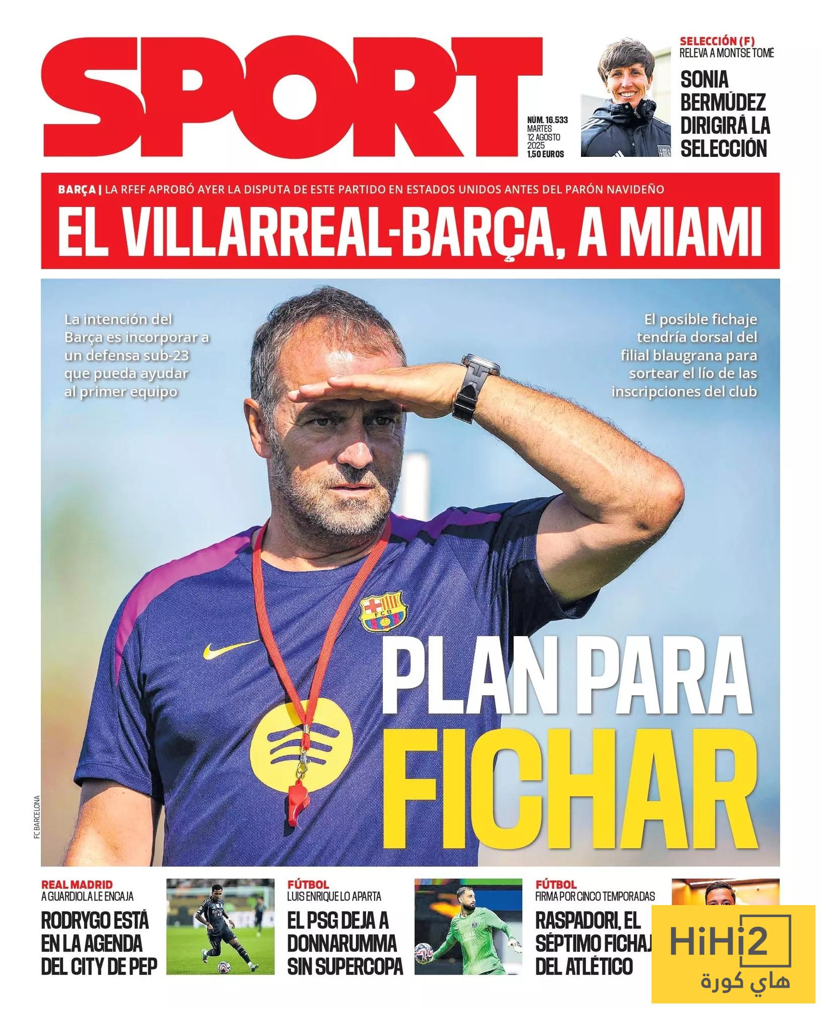 خطة التعاقد هي الخبر الرئيسي على غلاف صحيفة سبورت الكتالونية اليوم الثلاثاء 12 اغسطس 2025.