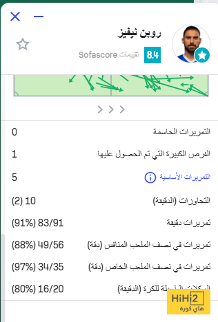 هاي كورة: قدم روبن نيفيز أداءً مميزًا أمام الشارقة، حيث سجل نسبة تمريرات صحيحة عالية، مع قدرة واضحة على استرجاع الكرة وقطع هجمات المنافس.