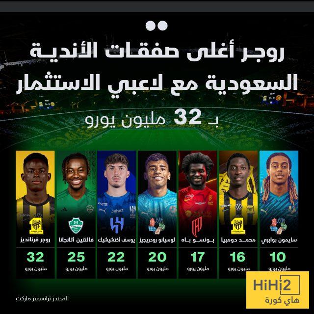 هاي كورة – شهدت فترة الانتقالات الصيفية إنفاقًا قياسيًا من الأندية السعودية في إطار بند الاستثمار، حيث تصدرت صفقة الاتحاد مع البرتغالي روجر فيرنانديز القائمة بقيمة 32 مليون يورو قادمًا من سبورتينج براغا، وفقًا لموقع “ترانسفير ماركت”.