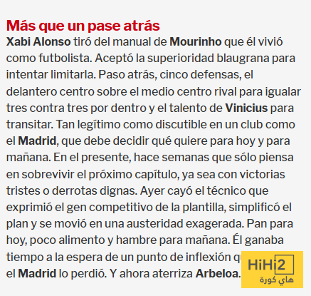 اتبع تشابي ألونسو أسلوب مورينيو ، الذي اختبره بنفسه كلاعب . تقبّل تفوق برشلونة في محاولة للحدّ منه . تراجع للخلف ، خمسة مدافعين ، مهاجم صريح يراقب لاعب الوسط الخصم لخلق وضعية ثلاثة ضد ثلاثة في الوسط ، وموهبة فينيسيوس في تحريك الكرة . أسلوب مشروع ، وإن كان مثيرًا للجدل ، في نادٍ بحجم ريال مدريد ، الذي عليه أن يحدد ما يريده اليوم وغدًا . في الوقت الحالي ، صار التركيز على البقاء على قيد الحياة في المباراة المقبلة ، سواء بفوز باهت أو خسارة مشرفة ، بالأمس ، رحل المدرب الذي استخرج الجينات التنافسية من الفريق ، وبسط الخطة وتحرك بأسلوب شديد الصرامة . كسب الوقت في انتظار نقطة تحول لم تحدث، وريال مدريد خسرها . والآن ، يحل أربيلوا محله …