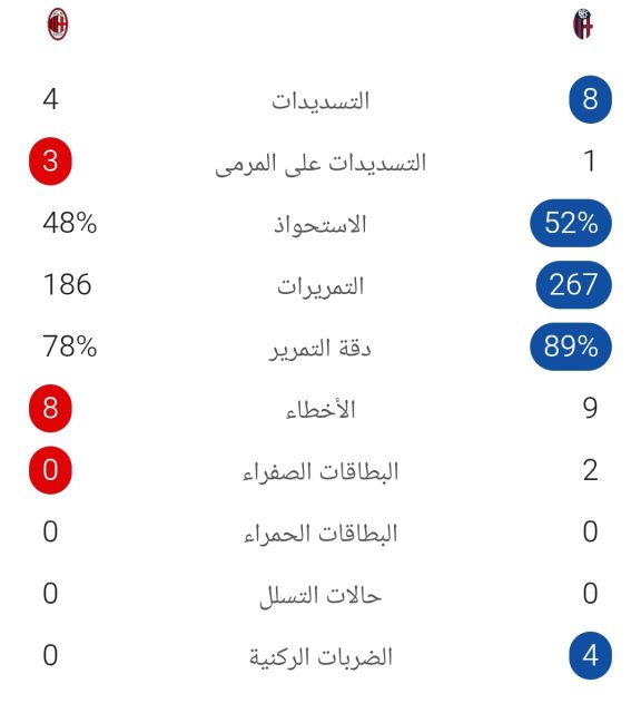 إحصائيات مباراة ميلان وبولونيا بعد مرور ساعة