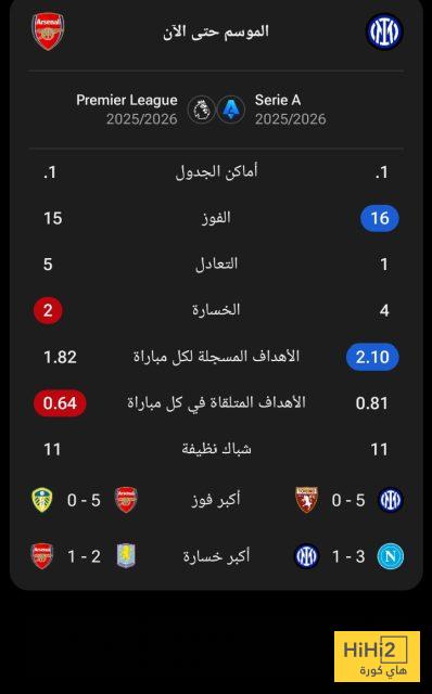 إليكم احصائيات الانتر وارسنال هذا الموسم في الدوري الايطالي و الإنجليزي: