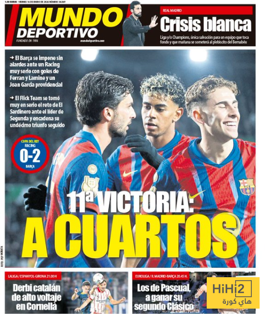 هاي كورة- انتصار برشلونة على راسينغ والتأهل الى ربع نهائي كأس ملك اسبانيا تصدر غلاف صحيفة موندو ديبورتفو الاسبانية اليوم الجمعة 16 يناير 2026 .