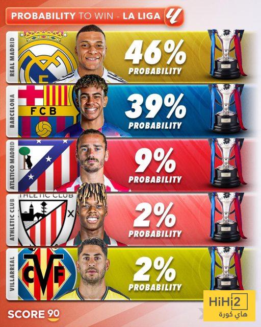 احتمالات التتويج بلقب الليغا في الموسم الجديد جاء على النحو التالي :