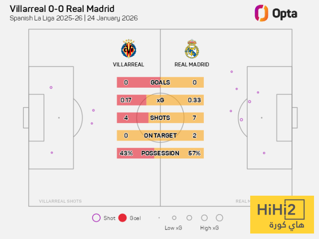 ريال مدريد هو الفريق الوحيد في الدوريات الخمس الكبرى في اوروبا الذي لم يستقبل اي تسديدة على المرمى في الشوط الاول من اي مباراة خلال عام 2026 .