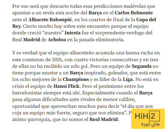 صحيح أن ألباسيتي يقدم أداءً جيدًا في بداية عام 2026 ، بأربعة انتصارات متتالية ، ثلاثة منها دون أن تهتز شباكه لكن فريقًا من الدرجة الثانية لا ينبغي أن يُرهب برشلونة المُلهِم والهداف، الذي وصل إلى ثمن نهائي دوري أبطال أوروبا ويتصدر الدوري الإسباني ، فريق هانز فليك ليس في أزمة . لكن التشاؤم حاضر دائمًا بين مشجعي برشلونة، خاصةً عندما يُعاني الفريق أمام فرق أضعف، وهي فرصة ينتهزها الكثيرون ليقولوا: “في اليوم الذي نواجه فيه فريقًا أقوى، سيُقصوننا حتمًا”، حسنًا، هيا يا رفاق، ارفعوا معنوياتكم، فنحن لسنا ريال مدريد .