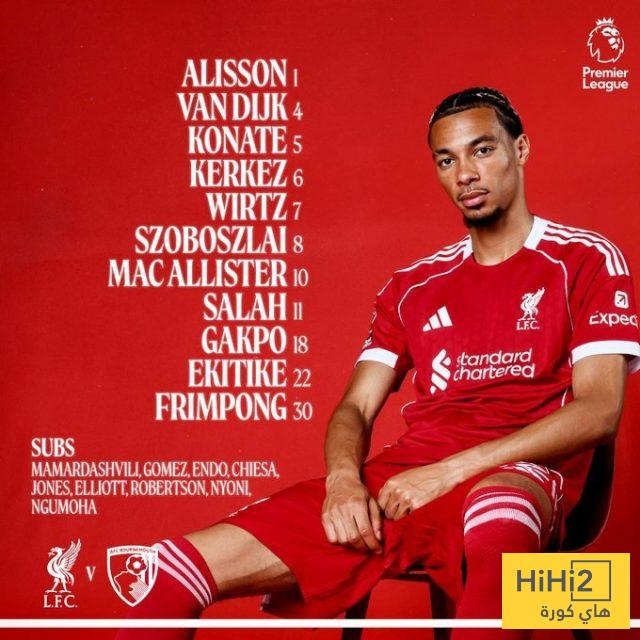 تشكيلة ليفربول الرسمية ضد بورنموث في الدوري الإنجليزي
