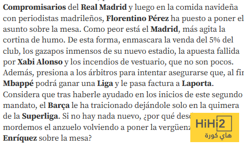 في اجتماع أعضاء ريال مدريد ثم في غداء الكريسماس مع صحفيي مدريد ، أثار فلورنتينو بيريز قضية نيغريرا مرة أخرى . كلما ساءت الأمور بالنسبة للريال ، كلما زاد فعلها بهذه الطريقة ، ليخفي فضيحة بيع 5 % من أسهم النادي ، والأخطاء الفادحة المحيطة بملعبهم الجديد ، والرهان الفاشل على تشابي ألونسو ، والعديد من الصراعات في غرفة الملابس . علاوة على ذلك ، يضغط على الحكام لضمان فوز مبابي بلقب الدوري أخيرًا ، ويسعى لتصفية حساباته مع لابورتا . بيريز يعتقد أن لابورتا ، بعد مساعدته في بداية ولايته الثانية ، خانه بتركه يخوض غمار حلم دوري السوبر وحيدًا . إذا لم يكن هناك جديد يُذكر ، فلماذا نقع نحن في في فخ إثارة فضيحة نيغريرا مجددًا ؟