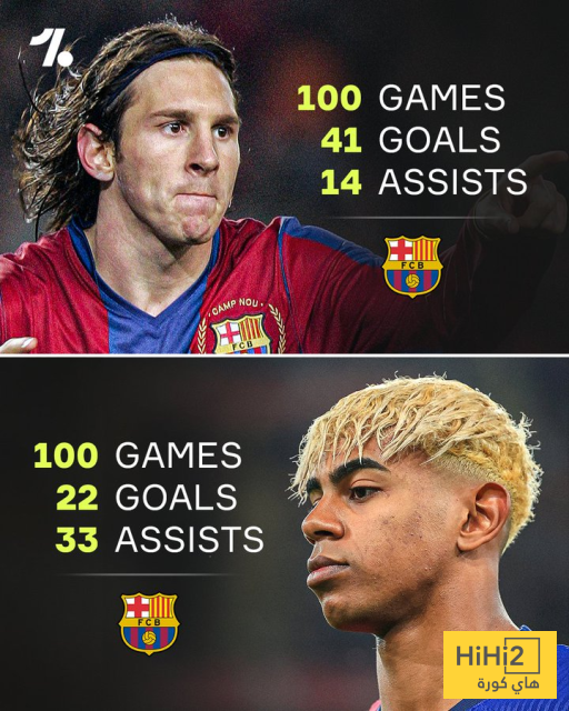 لامين يامال حقق نفس عدد المساهمات التهديفية التي حققها ليونيل ميسي في اول 100 مباراة له مع البارسا .