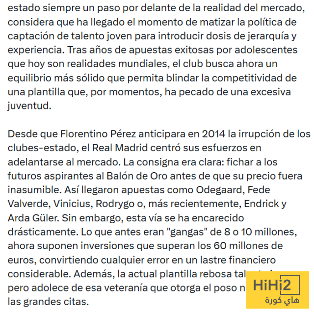 منذ أن استشرف فلورنتينو بيريز صعود الأندية المملوكة للدولة عام 2014 ، ركز ريال مدريد جهوده على استباق السوق . كان الهدف واضحًا وهو التعاقد مع لاعبين مرشحين للكرة الذهبية قبل أن يصبح سعرهم باهظا وقد أدى ذلك إلى التعاقد مع لاعبين مثل أوديغارد ، وفيدي فالفيردي ، وفينيسيوس ، ورودريغو ، ومؤخرا إندريك وأردا غولر ، مع ذلك أصبح هذا المسار مكلفا للغاية فما كان يعتبر سابقا “صفقات رابحة” بقيمة 8 أو 10 ملايين يورو ، بات يتطلب استثمارات تتجاوز 60 مليون يورو ، مما يجعل أي خطأ عبئا ماليا كبيرا علاوة على ذلك يزخر الفريق الحالي بالمواهب الشابة لكنه يفتقر إلى الخبرة اللازمة لتوفير الثبات المطلوب في المباريات الكبيرة .