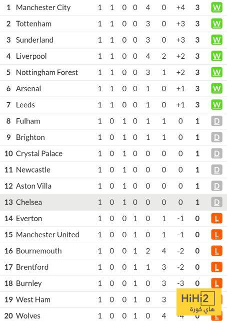 جدول ترتيب الدوري الإنجليزي بعد نهاية الجولة الأولى
