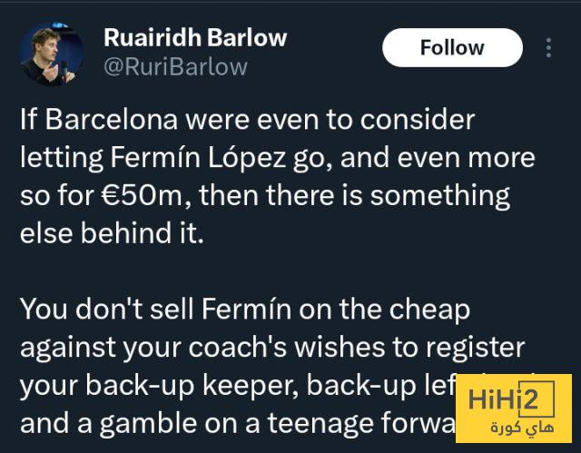 وقال بارلو: “إذا كان برشلونة يفكر حتى في السماح برحيل فيرمين لوبيز، خصوصًا مقابل 50 مليون يورو فقط، فهذا يعني أن هناك أمورًا أخرى وراء القرار، لا يمكنك بيع فيرمين بهذا السعر المنخفض، ضد رغبة المدرب، فقط من أجل تسجيل حارس بديل، وظهير أيسر بديل، ومراهنة على مهاجم مراهق.”