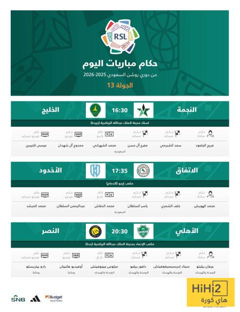 هاي كورة – كشف الحساب الرسمي للاتحاد السعودي لكرة القدم عن الطواقم التحكيمية المكلفة بإدارة مباريات الجولة الـ 13 من دوري روشن للمحترفين ، حيث يشهد اليوم الجمعة إقامة 3 مباريات قوية .