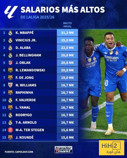 ويتصدر نجوم ريال مدريد القائمة من المركز الاول الى الرابع فيحتل مبابي المركز الاول براتب يصل الى 31.3 مليون يورو يليه فينيسيوس (25 مليون يورو ) ، الابا وبيلينغهام فيما يتواجد ليفاندوفسكي في المركز الرابع .