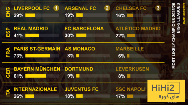 هاي كورة- كشفت تكهنات المركز الدولي للدراسات الرياضية عن حظوظ الاندية في التنافس على اللقب في الموسم الجديد من الدوريات الاوروبية الخمسة الكبرى بعد ثلاث جولات من المنافسات.