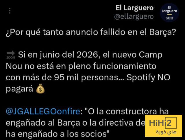 “إذا لم يكن ملعب الكامب نو الجديد جاهزًا للعمل بكامل طاقته مع أكثر من 95 ألف متفرج في يونيو 2026، سبوتيفاي لن تدفع للنادي الكتالوني”.