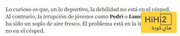 ” رغم الطموحات الرياضية الكبيرة، فإن العدو الأكبر لبرشلونة يبقى داخليًا، نتيجة لاختلال مؤسسي وسوء إدارة متجذّر، النادي لا يواجه فقط منافسين أقوياء رياضيًا واقتصاديًا، بل يواجه قبل كل شيء نفسه، الضعف لا يكمن في الفريق نفسه، بل في المؤسسة، ظهور مواهب شابة مثل بيدري ولامين يامال شكّل نفحة أمل لجماهير برشلونة، لكن الأزمات الإدارية تطغى على المشهد.”.