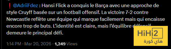” نجح هانسي فليك في إقناع برشلونة باتباع نهج كرويف القائم على كرة القدم الهجومية ، ويعكس الفوز الساحق 7-2 على نيوكاسل فريقا يسجل الأهداف بسهولة ولكنه لا يزال يستقبل الكثير من الاهداف ، الهوية واضحة ، لكن التوازن الدفاعي يبقى التحدي الاكبر ” .