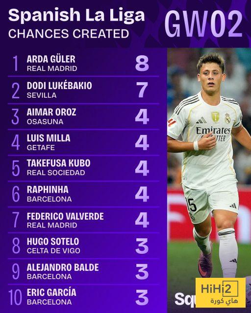 هاي كورة – تكشف أرقام الجولة الثانية من الدوري الإسباني، عن تفوق أردا غولر ، نجم ريال مدريد، على كافة لاعبي البطولة في صناعة الفرص التهديفية.