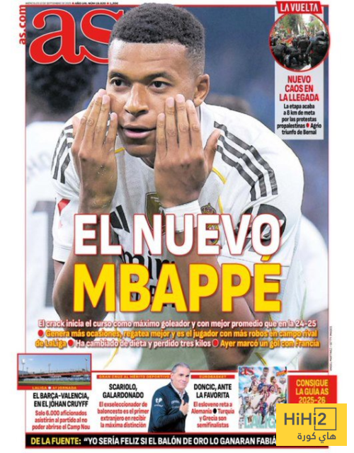 هاي كورة- تغنت صحيفة أس الاسبانية بكيليان مبابي نجم ريال مدريد الذي تصدر غلافها اليوم الاربعاء 9 سبتمبر 2025.