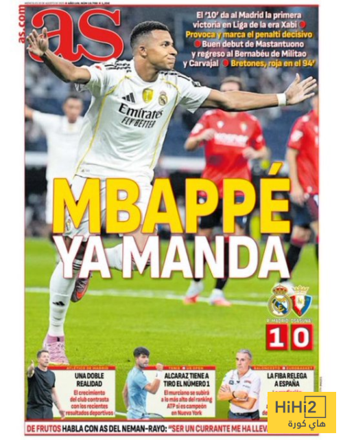 هاي كورة- تصدر فوز الريال على اوساسونا بهدف نظيف سجله كيليان مبابي الصفحة الاولى من غلاف صحيفة أس الاسبانية اليوم الاربعاء 20 اغسطس .