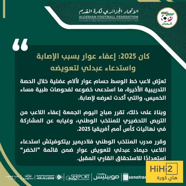 هاي كورة – أعلن الاتحاد الجزائري لكرة القدم رسميًا عن استبعاد لاعب خط الوسط حسام عوار ، المحترف في صفوف الاتحاد ، من القائمة المشاركة في بطولة كأس أمم إفريقيا ، التي تقام في الفترة من 21 ديسمبر الحالي حتى 18 يناير 2026 ، للإصابة .