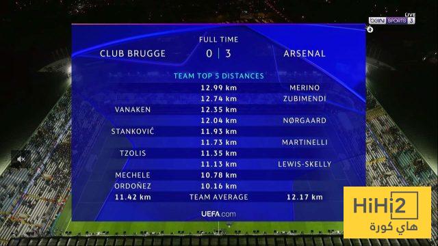 ميكيل ميرينو لاعب ارسنال كان الأكثر ركضا في المباراة أمام كلوب بروج بدوري أبطال أوروبا بواقع ١٢.٩٩ كيلو متر.
