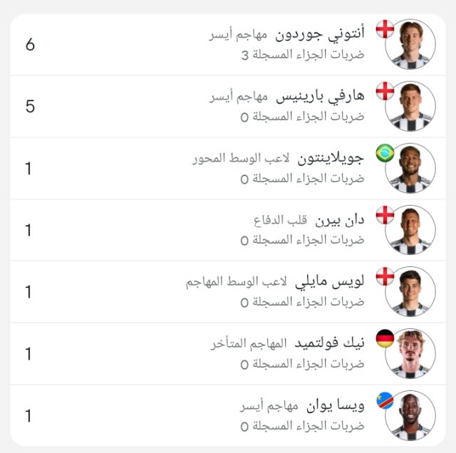 وجاءت قائمة هدافي نيوكاسل كالتالي :